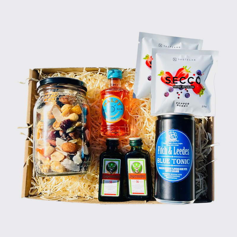 Mixed nuts in jar, 2 mini Jagermeister, 1 mini gin, 1 tonic water can, 2 secco sachets