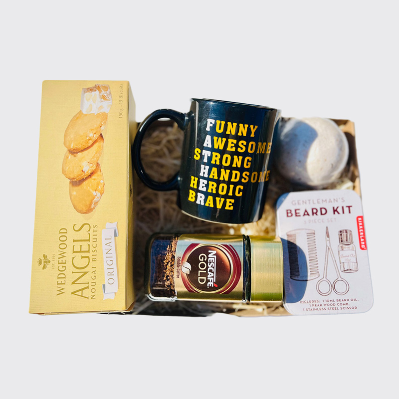 Gourmet biscuits, Father’s Day mug, Bath bomb, mini coffee, Beard kit