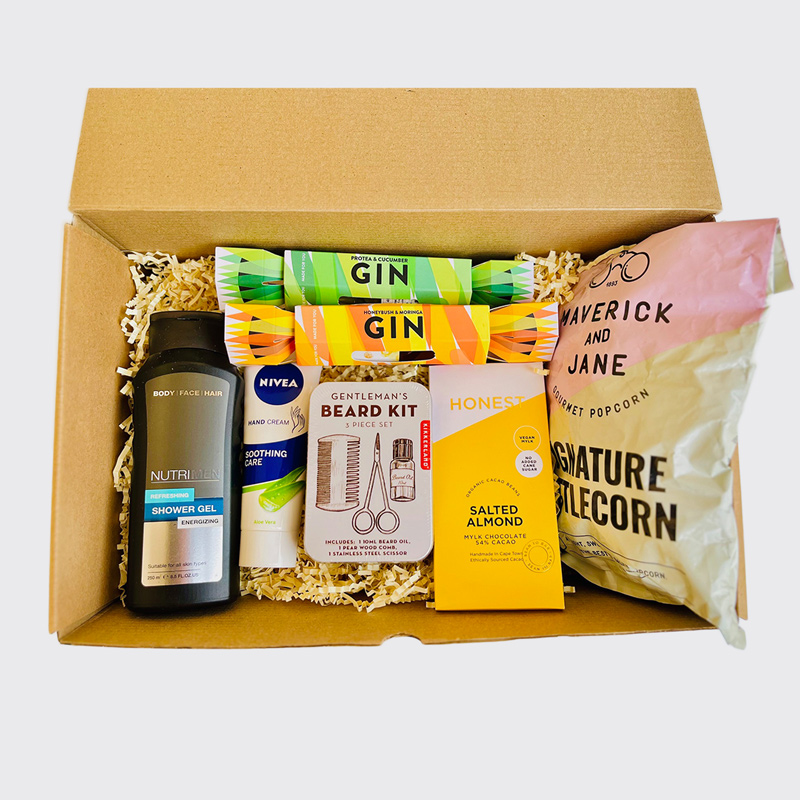 Men shower gel, me hand vream, beard kit, honest artisanal chocolate, gourmet popcorn slab, 2 mini gin crackers