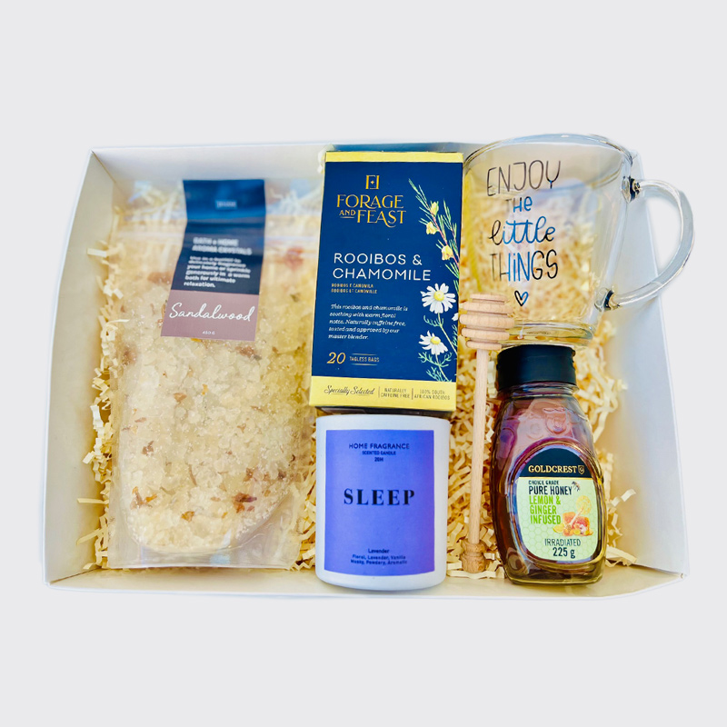 bath salt, flavored tea box, personalised mug, scented candle, honey with honey dipper